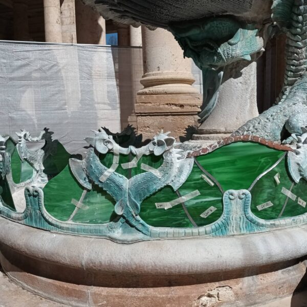 Lavoro: Restauro conservativo con sostituzione dei vetri curvi rotti e mancanti con inserimento di nuovi piombi di collegamento e sigillatura perimetrale.